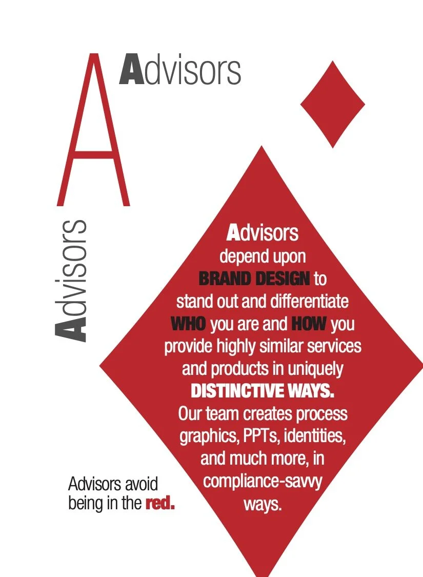 Advisors depend upon BRAND DESIGN to stand out and differentiate WHO you are and HOW you provide highly similar services and products in uniquely DISTINCTIVE WAYS. Our team creates process graphics, PPTs, identities, and much more, in compliance-savvy ways.