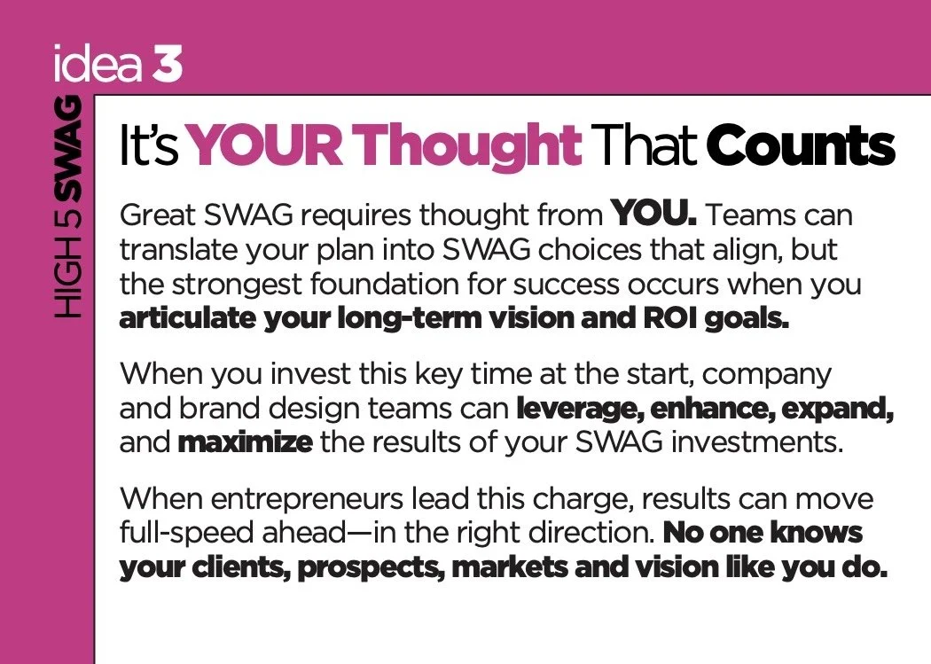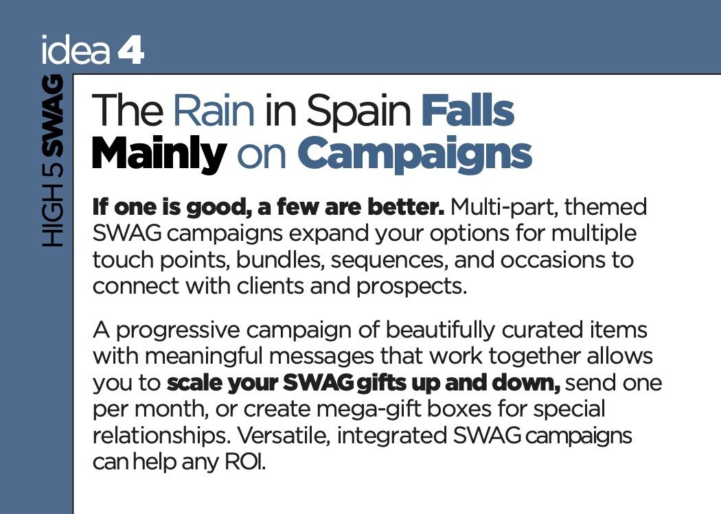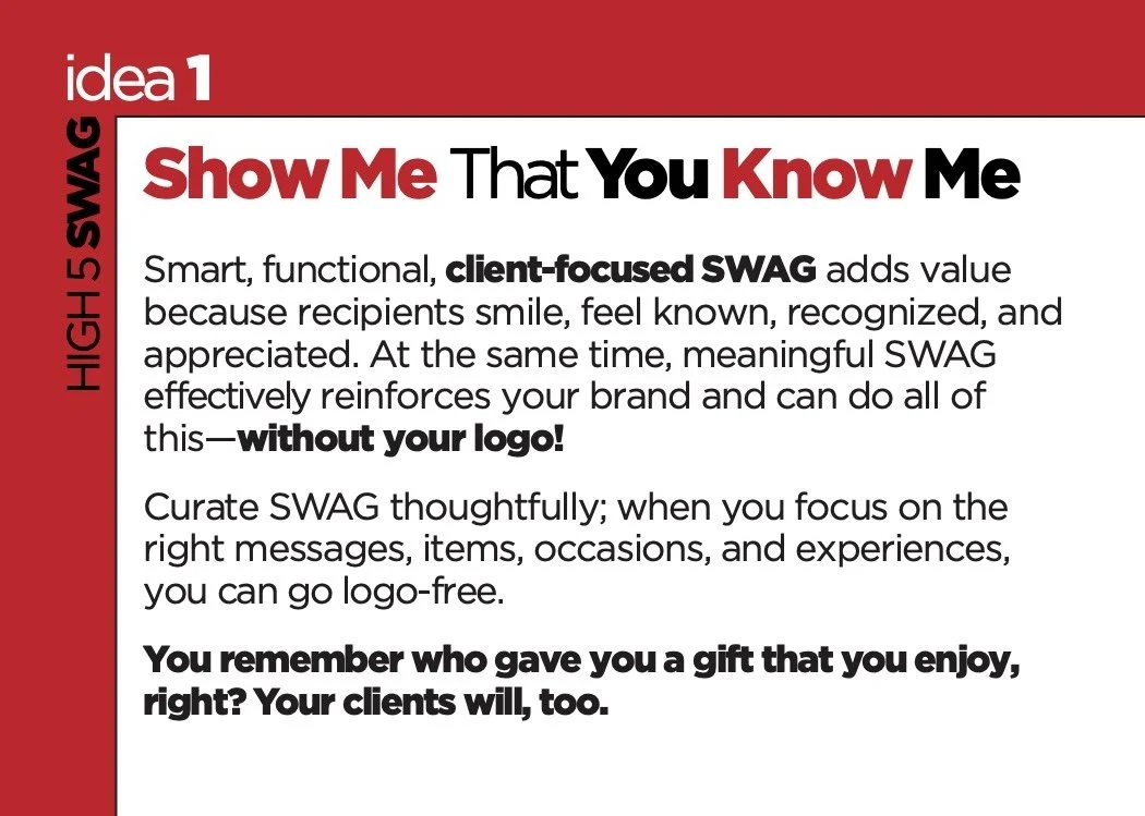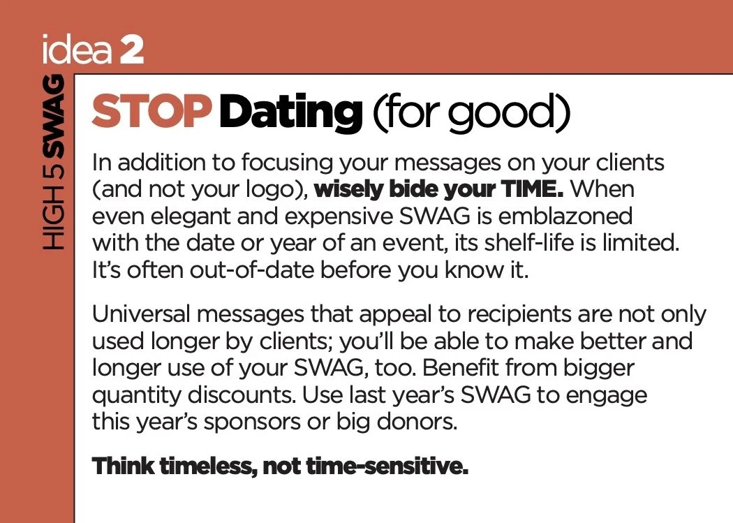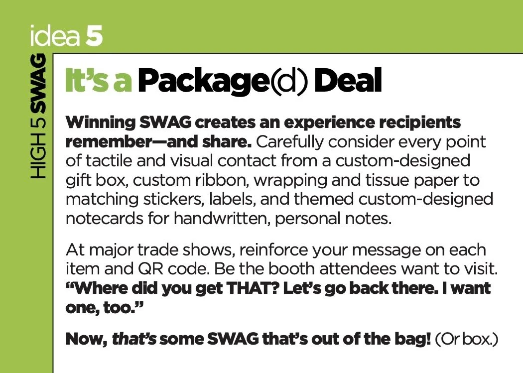 SWAG recipients will keep and use, client gifts, trade events, lumpy mail strategies, & more